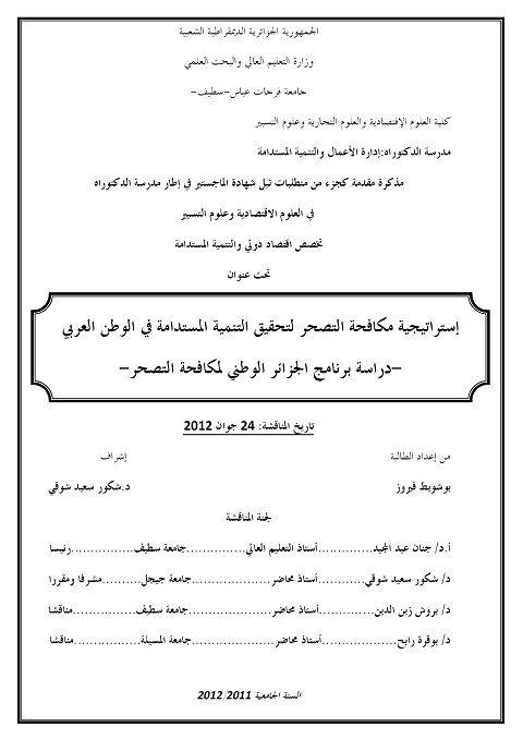 إستراتيجية مكافحة التصحر لتحقيق التنمية المستدامة في الوطن العربي : دراسة برنامج الجزائر الوطني لمكافحة التصحر سنة النشر: 2019 المؤلف: Boshwait Qairouz إن البحث عن استراتيجيات مستدامة لمكافحة التصحر تحترم البيئة الطبيعية وتحقق العدالة الاجتماعية إضافة إلى تحقيق الفعالية الاقتصادية في المناطق المتضررة من العالم أصبحت من القضايا الهامة التي تخص كل الدول خاصة الدول العربية، لما لمشكلة التصحر من عواقب وخيمة تعود بالضرر على اتمعات البشرية من الناحية الاقتصادية والاجتماعية وكذا البيئية، وبالتالي عدم تحقق التنمية المستدامة التي أصبحت من متطلبات العصر والرامية إلى تحسين الجانب الاجتماعي والاقتصادي تحت إطار حماية البيئة. ومنه نطرح التساؤل التالي: هل تتبع الدول العربية إستراتيجية واحدة لمكافحة التصحر والتي تأخذ في الاعتبار مبادئ التنمية المستدامة؟ وما هو واقع ذلك في الجزائر من خلال البرنامج الوطني لمكافحة التصحر؟