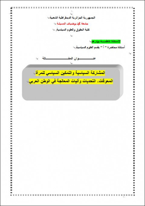 التربية البيئية كإستراتيجية من أجل تفعيل المواطنة البيئية (vol.8, no.2 مجلة أبحاث) سنة النشر: 2023 المؤلف: Bel'asal Bint Nabi Yasmine, Amroush Al Houcine المؤلف المؤسسي: Yahia Fares University of Medea في هذه الورقة البحثية سنحاول التطرق إلى التربية البيئية كإستراتيجية من أجل تفعيل المواطنة البيئية، فقد شغلت البيئة بال الكثير من المفكرين والباحثين على مختلف اختصاصاتهم في بدايات النصف الثاني من القرن الماضي فبرز مفهوم المواطنة البيئية كمصطلح حيوي يتم استخدامه لتعزيز مسؤولية المواطن تجاه بيئته، وحتى تتحقق المواطنة البيئية لابد من وجود تربية بيئية تعمل على غرس الاتجاهات والقيم والسلوكيات البيئية، وتهدف إلى توضيح المفاهيم وتنمية المهارات اللازمة لفهم وتقدير العلاقات التي تربط بين الإنسان وثقافته وبيئته.