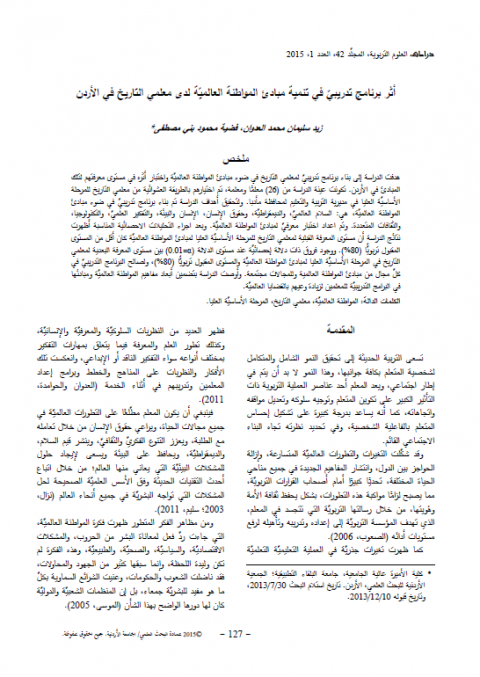 أثر برنامج تدريبيّ في تنمية مبادئ المواطنة العالميّة لدى معلمي التاريخ في الأردن سنة النشر: 2013 المؤلف: Zaid Suleiman M. Al-Edwan | Fadyieh Mohmoud A. Bani Mustafa المؤلف المؤسسي: Deanship of Scientific Research, University of Jordan هدفت الد ا رسة إلى بناء برنامج تدريبيّ لمعلمي التاريخ في ضوء مبادئ المواطنة العالميّة واختبار أثره في مستوى معرفتهم لتلكالمبادئ في الأردن. تكونت عينة الد ا رسة من ( 26 ) معلمًا ومعلمة، تم اختيا رهم بالطريقة العشوائية من معلمي التاريخ للمرحلةالأساسيّة العليا في مديرية التربية والتعليم لمحافظة مأدبا. ولتحقيق أهداف الد ا رسة تم بناء برنامج تدريبيّ في ضوء مبادئالمواطنة العالميّة، هي: السلام العالميّ، والديمق ا رطيّة، وحقوق الإنسان، الإنسان والبيئة، والتفكير العلميّ، والتكنولوجيا،والثقافات المتعددة. وتم اعداد اختبار معرفيّ لمبادئ المواطنة العالميّة. وبعد اج ا رء التحليلات الاحصائية المناسبة أظهرتنتائج الد ا رسة أن مستوى المعرفة القبلية لمعلمي التاريخ للمرحلة الأساسيّة العليا لمبادئ المواطنة العالميّة كان أقل من المستوى0.01 ) بين مستوى المعرفة البعدية لمعلمي =α) المقبول تربويًّا ( 80 %). ووجود فروق ذات دلالة إحصائيّة عند مستوى الدلالةالتاريخ في المرحلة الأساسيّة العليا لمبادئ المواطنة العالميّة والمستوى المقبول تربويًّا ( 80 %)، ولصالح البرنامج التدريبيّ فيكلّ مجال من مبادئ المواطنة العالمية وللمجالات مجتمعة. وأوصت الد ا رسة بتضمين أبعاد مفاهيم المواطنة العالميّة ومبادئهافي الب ا رمج التدريبيّة للمعلمين لزيادة وعيهم بالقضايا العالميّة.الكلمات الدالة: المواطنة العالميّة، معلمي التاريخ، المرحلة الأساسيّة العليا..