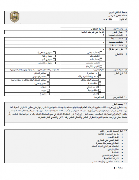 مقرر التربية على المواطنة العالمية سنة النشر: 2019 هذا المقرر قام بوضعه مجموعة من الاساتذة بكلية التربية في جامعة السلطان قابوس، وقد جاء هذا المقرر كفكرة بالتعاون بين الجامعة ومكتب اليونسكو ببيروت وأيضا مركز أسيا والمحيط الهادي للتربية من أجل التعاون الدولي. ويهدف المقرر إلى تعريف الطالب بمفهوم المواطنة العالمية ومبادئها وخصائصها، وصفات المواطن العالمي وأدواره في تحقيق الاستقرار التنمية، كما يهدف المقرر إلى ترسيخ مبادئ التربية من أجل السلام والتسامح وقبول ألآخر وعلاقة المواطنة العالمية بحقوق الانسان وقيم العدالة والتماسك العالمي، ونظرة الإسلام إلى المسؤولية المجتمعية، ويهدف المقرر إلى إبراز دور المنظمات الدولية في صنع السياسات الدولية وتعزيز قيم المواطنة العالمية، ودور سلطنة عمان في إرساء مفاهيم الأمن والاستقرار العالمي والتعايش السلمي وتقبل الآخر والتصدي للفكر المتطرف.
