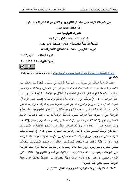 دور المواطنة الرقمية في استخدام التكنولوجيا والتقليل من الاخطار الناجمة عنها (الاستاذ للعلوم الانسانية والاجتماعية; no.3, vol.59) سنة النشر: 2020 المؤلف: Amal Mohammed Abdullah Albado المؤلف المؤسسي: University of Baghdad. College of Education Ibn Rushd هدفت الدراسة الحالية الى معرفة دور المواطنة الرقمية في استخدام التكنولوجيا والتقليل من الاخطار الناجمة عنها، فقد استخدمت الباحثة المنهج الوصفي التحليلي، واستبانة لمعرفة هل هناك دور للمواطنة الرقمية في استخدام التكنولوجيا والتقليل من الاخطار الناجمة عنها، وتكونت عينة الدراسة من (102) موظف في وزارة التربية والتعليم لواء ماركا (قصبة عمان الرابعة). تكونت الاستبانة من محورين رئيسين، المحور الاول المعرفة بمفهوم المواطنة الرقمية، المحور الثاني دور المواطنة الرقمية في استخدام التكنولوجيا والتقليل من أخطار التكنولوجيا. ودلت نتائج الدراسة على أن معرفة عينة الدراسة لمفهوم المواطنة الرقمية بدرجة مرتفعة ؛ فقد كان الوسط الحسابي يساوي (3.887) على مقياس ليكرت الخماسي والانحراف المعياري يساوي(0.97). ودلت النتائج على أن وجود دور قوي للمواطنة في التقليل من الاخطار الناجمة عن التكنولوجيا ؛ فقد كان الوسط الحسابي يساوي (4.2) والانحراف المعياري يساوي (0.94).