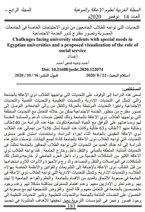 التحديات التي تواجه الطلاب الجامعيين من ذوي الاحتياجات الخاصة في الجامعات المصرية وتصور مقترح لدور الخدمة الاجتماعية (المجلة العربية لعلوم الإعاقة والموهبة ;no.14, vol.4) سنة النشر: 2020 المؤلف: Ahmed Wagih Fathy Ahmed المؤلف المؤسسي: Arab Institution for Education, Science and Arts (AIESA) تسعى هذه الدراسة إلى الوقوف على التحديات التي يواجهها الطلاب ذوي الإعاقة بالجامعة والتي تتمثل في التحديات الإدارية والتحديات التعليمية والتحديات النفسية والتحديات الاجتماعية وأخيراً التحديات المرتبطة بالحركة والتنقل من وإلى الجامعة، والتوصل إلى تصور مقترح من منظور الخدمة الاجتماعية يمكن من خلاله التعامل مع التحديات المختلفة التي يواجهها الطلاب ذوي الإعاقة بالجامعة وذلك لتفعيل خدمات الدعم والمساندة المقدمة لهم ومساعدتهم علي التوافق مع الحياة الجامعية، تكونت عينة هذه الدراسة من 140 طالب وطالبة منهم 77 طالب و63 طالبة وكانت هذه النسبة تمثل 56% من إجمالي عدد الطلاب ذوي الإعاقة المقيدين بالجامعة أثناء إجراء الدراسة، واستخدمت استبان تقدير مستوى التحديات التي تواجه الطلاب ذوي الاعاقة بالجامعة كأداة لجمع البيانات.