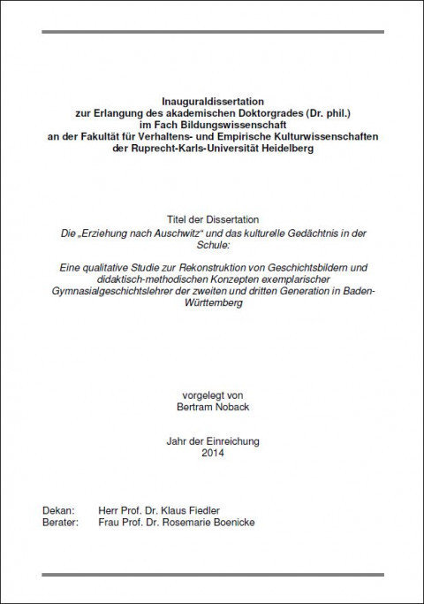 Jugendliche aus Einwandererfamilien und die Geschichte des Nationalsozialismus سنة النشر: 2003 المؤلف: V. B. Georgi Based on 55 interviews with young Germans with immigrant family background from the age of 15–20, Giorgi constructs a typology of how they position themesleves to the German Nazi past.  Nationalsozialismus im Geschichtsunterricht: Beobachtungen unterrichtlicher Kommunikation سنة النشر: 2002 المؤلف المؤسسي: Johann Wolfgang Goethe University This is a pilot study about the potential of history education about Nazism and the Holocaust. The aim is, 1) to establish whether it is possible to conduct empirical analysis about “Education after Auschwitz,” and 2) based on empircal observation improve the theoretical assumptions about the relationship between education and the specific theme of Nazism and the Holocaust. The empirical part consists of five case studies about different aspects of “Holocaust education” in two Upper Secondary schools in Frankfurt.The above abstract is taken from the International Holocaust Remembrance Alliance Education Research Project. Please also consult the full list of abstracts in 15 languages and the accompanying publication Research in Teaching and Learning about the Holocaust: A Dialogue Beyond Borders.Ed: IHRA, Monique Eckmann, Doyle Stevick, Jolanta Ambrosewicz-Jacobs, 2017, Metropol Verlag at http://www.holocaustremembrance.com/publications. Trauerimperativ: Jugendliche und ihr Umgang mit dem Holocaust (-Denkmal) سنة النشر: 2013 المؤلف: M. Klein المؤلف المؤسسي: Bundeszentrale für politische Bildung The author analyzes German student’s visit at the memorial for the murdered Jews in Berlin. Empirical qualitative study.The above abstract is taken from the International Holocaust Remembrance Alliance Education Research Project. Please also consult the full list of abstracts in 15 languages and the accompanying publication Research in Teaching and Learning about the Holocaust: A Dialogue Beyond Borders.Ed: IHRA, Monique Eckmann, Doyle Stevick, Jolanta Ambrosewicz-Jacobs, 2017, Metropol Verlag at http://www.holocaustremembrance.com/publications. Zwischen Vermittlungsanspruch und emotionaler Wahrnehmung: Die Gestaltung neuer Dauerausstellungen in Gedenkstätten für NS-Opfer in Deutschland und deren Bildungsanspruch سنة النشر: 2009 المؤلف: Thomas Lutz Over the last decade, as part of the federal concept for memorial sites, twenty new permanent exhibitions were developed. This dissertation undertakes to examine exhibitions created at memorial sites for victims of the Nazi regime from an educational and museological viewpoint. Expert interviews with exhibition curators serve as the basis for the empirical study. The author has worked for many years in the field of memorial museums education. He applied “action research,” developed in German-speaking countries under the term “Handlungsforschung.” The study analyzes the specific characteristics of the work conducted in museums, memorial sites and educational centres and also addresses the strained connection between commemoration and learning in the educational work of the memorial museums for the Nazi victims. The study also evaluates the practical impact of these aims. The very intense form of commemorative work that is conducted in Germany is justified by the nature of its subject matter: the stigmatization of specific victim groups during the Nazi era according to a system of political, racist-biological and social characteristics and the vast dimensions of the genocide. The socially and politically explosive nature of this task is manifested by the commemoration of the “other” victims as well as by the responsibility that Germany bears for addressing its “own” perpetrators in society. The central findings of the study show that the new exhibitions embrace a much more comprehensive foundation of historical material (historical knowledge, building history and archeological significance of the crime sites, written and audio-visual survival testimony and artifacts) as was previously the case. The professionalization of the “field of memorial museums” has led to a more intensively reflected and sensitive approach to handling documents, illustrations and objects on display in a museum. In particular, the significance of the relationship between the artifacts and their location, their sources, an appreciation for their origins and a critical reflection of what it is they convey is achieved. This also applies to photography. (Written by author) The above abstract is taken from the International Holocaust Remembrance Alliance Education Research Project. Please also consult the full list of abstracts in 15 languages and the accompanying publication Research in Teaching and Learning about the Holocaust: A Dialogue Beyond Borders.Ed: IHRA, Monique Eckmann, Doyle Stevick, Jolanta Ambrosewicz-Jacobs, 2017, Metropol Verlag at http://www.holocaustremembrance.com/publications. Die “Erziehung nach Auschwitz” und das kulturelle Gedächtnis in der Schule: Eine qualitative Studie zur Rekonstruktion von Geschichtsbildern und didaktisch-methodischen Konzepten exemplarischer Gymnasialgeschichtslehrer der zweiten und dritten Generation in Baden-Württemberg سنة النشر: 2014 المؤلف: Bertram Noback This is a qualitative study based on interviews with 56 German history teachers working in different upper secondary schools in Baden-Württemberg. The author asks whether the theme of National Socialism is considered to be a normal topic in history teaching for contemporary German teachers or if they view it as key problem for education in schools. He therefore tries to reconstruct teachers’ images of history and their subjective theories concerning the treatment of National Socialism in history education. Among history teachers of the third generation the author distinguishes between three ideal types