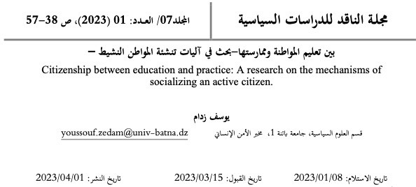 بين تعليم المواطنة وممارستها -بحث في آليات تنشئة المواطن النشيط (vol.7, no.1 مجلة الناقد للدراسات السياسية) سنة النشر: 2023 المؤلف: Yusuf Zadam المؤلف المؤسسي: جامعة محمد خيضر بسكرة تقدم الدراسة بحثا في العلاقة بين المواطنة والتعليم، من خلال التساؤل عن الآليات الدقيقة لتنشئة المواطن النشيط. محاججا بأن تعليم المواطنة لا يكفي، بل يجب ممارسة الديمقراطية في مختلف مؤسسات وعمليات وسلوكيات الفاعلين في الوسط المدرسي. لذلك تضمنت الدراسة تدقيقا في طبيعة المواطن المرغوب والمواطنة المنشودة، مؤكدا على أن هناك فرق بين "المواطن النشيط" و"المتلقي السلبي". كما تضمنت آليات الانتقال من تعليم المواطنة إلى فهم الديمقراطية. توصلت الدراسة إلى أن المدرسة هي "مصنع" المواطنين النشطين والمتلقين السلبيين، وبالتالي فإن طبيعة العلاقة التي تحكم مختلف الفاعلين في البيئة المدرسية هي التي تحدد نوع المواطن.
