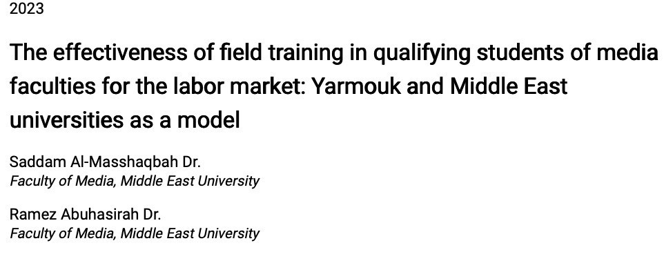 فاعلية التدريب الميداني في تأهيل طلبة كليات الإعلام لسوق العمل: جامعتا اليرموك والشرق الأوسط أنموذجا سنة النشر: 2023 المؤلف: Saddam Al-Masshaqbah | Ramez Abuhasirah هدفت الدراسة التعرف إلى فاعلية مساق التدريب الميداني في رفع قدرات طلبة كليات الإعلام بالجامعات الأردنية الحكومية والخاصة، وتأهيلهم لسوق العمل، واستندت الدراسة إلى منهج مسح الجمهور، بالتطبيق على عينة عشوائية بسيطة قوامها (264) طالبا وطالبة في كليتي الإعلام بجامعة الشرق الأوسط وجامعة اليرموك، وأظهرت النتائج أن درجة التزام الطلبة بالدوام خلال فترة التدريب الميداني في المؤسسات الإعلامية جاءت بدرجة "كبيرة جدا" بنسبة (%39.8)، بينما جاءت درجة استفادتهم من التدريب الميداني بدرجة "متوسطة" وبنسبة (%29.2)، وتمثلت أبرز المجالات التي تدرب عليها الطلبة في: "التحرير الصحفي"، و"إعداد البرامج الإذاعية والتلفزيونية"، و"فن الإلقاء والتقديم"، وخلصت نتائج الدراسة إلى أن واقع التدريب الميداني لطلبة كليتي الإعلام بجامعة الشرق الأوسط وجامعة اليرموك قد تمثل في: "قرب المسافة بين مكان السكن والمؤسسة الإعلامية مهم في الاستفادة من التدريب" بوسط حسابي بلغ (4.27) وبدرجة مرتفعة، بينما تمثلت فاعلية التدريب الميداني في تأهيل الطلبة لسوق العمل في: "التعرف إلى آلية عمل المؤسسة الإعلامية"، و"اكتساب العلاقات الجديدة في سوق العمل"، و"التعرف إلى مشكلات العاملين في المؤسسات الإعلامية".