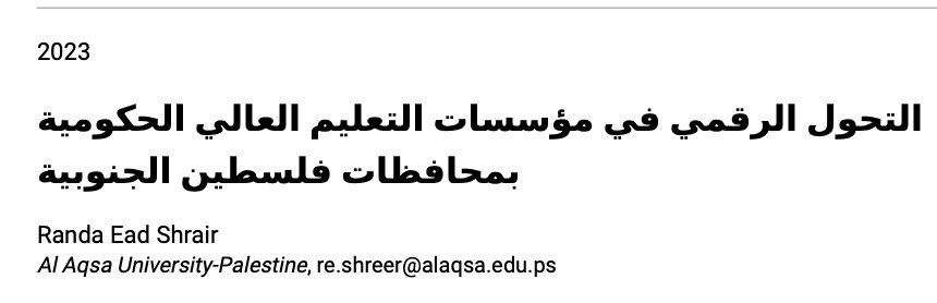 التحول الرقمي في مؤسسات التعليم العالي الحكومية بمحافظات فلسطين الجنوبية سنة النشر: 2023 المؤلف: Randa Ead Shrair هدفت الدراسة التعرف إلى مستوى التحول الرقمي في مؤسسات التعليم العالي الحكومية بمحافظات فلسطين الجنوبية من وجهة نظر أعضاء هيئاتها التدريسية، والكشف عما إذا كان هناك فروق ذات دلالة إحصائية عند مستوى الدلالة (0.05≥α)، بين متوسطات استجابات أفراد العينة حول مستوى التحول الرقمي في مؤسسات التعليم العالي الحكومية بمحافظات فلسطين الجنوبية تعزى لمتغيرات: (الجنس، سنوات الخدمة، والدرجة العلمية، والتخصص)، وباستخدام المنهج الوصفي/ المسحي، والرجوع للأدبيات السابقة، تم بناء استبانة تكونت من (30) فقرة موزعة على (4) مجالات، وبعد التأكد من صدقها وثباتها، تم تطبيقها على عينة عشوائية بسيطة مكونة من (123) عضو هيئة تدريس، وقد توصلت الدراسة ًإلى أن مستوى التحول الرقمي في مؤسسات التعليم العالي جاء "كبيرا"، ولم توجد فرق ذو دلالة إحصائية بين متوسطات استجابات أفراد العينة حول مستوى التحول الرقمي في تلك المؤسسات تعزى لمتغيرات الدراسة.