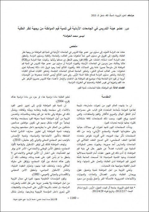 مدى توافر قیم المواطنة ومفاھیمھا في كتب التربیة الوطنیة بالمملكة العربیة السعودیة من وجھة نظر المعلمین سنة النشر: 2014 المؤلف المؤسسي: Assiut University هدفت الدراسة الحالية إلى الكشف عن القيم والمفاهيم المتضمنة في كتب التربيـة الوطنية في المملكة العربية السعودية، وتقييمات المعلمين لمدى توفر تلك القيم والمفـاهيم . ولتحقيق ذلك قام الباحث بتحليل محتوى كتب التربية الوطنية لجميع الـصفوف (الرابـع الابتدائي – الثالث الثانوي )، كما تم اختيار عينة مكونة من (١٨٠) معلماً مـن معلمـي التربية الوطنية االذين يدرسون خلال العام الدراسي ٢٠٠٩/٢٠١٠م، الصفوف من الرابع ولغاية الثالث الثانوي في مدارس منطقة القصيم . كما تم بناء أداتـين الأولى اسـتخدمت لتحليل محتوى كتب التربية الوطنية، أما الأداة الثانية فقد استخدمت لتقييمـات معلمـي التربية الوطنية لمحتوى الكتب . بينت النتائج عدم وجود توزان في توزيع القيم الإجتماعيـة (الصدق، الأمانة، التعاون ) للصفوف السادس - الأول الثانوي . كما تبين وجود عدد كبير من القيم الإجتماعية المتضمنة في كتب التربية الوطنية في المملكة العربية السعودية مقارنـة بالقيم الشخصية والعالمية . دلت النتائج إلى أن تقييمات المعلمين للقيم والمفاهيم المتضمنة في كتب التربية الوطنية في المملكة العربية السعودية في المجال الشخصي كـان مرتفعـاً، وأن تقييمات المعلمين للقيم والمفاهيم المتضمنة في كتب التربية الوطنيـة في المملكـة العربيـة السعودية في المجال الوطني والإجتماعي كان متوسطاً . كما أن تقييمات المعلمـين للقـيم والمفاهيم المتضمنة في كتب التربية الوطنية في المملكة العربية السعودية في المجال العالمي كان متوسطاً. وقد خرجت الدراسة بمجموعة من التوصيات بالإستناد إلى نتائج الدراسة. مقاربة بنائية-اجتماعية لتعليم/تعلم أرض لشعوب عدة ذات مذاهب مختلفة سنة النشر: 2012 المؤلف المؤسسي: University of Balamand نتيجة لاستطلاع للرأي، أفاد بعض الطلاب أن عملية تعليم/ تعلم مادة التاريخ في المراحل ما قبل الجامعية تعتبر فاشلة لكون التعليم سردياً والتعلم محفوظات للترداد وقت الامتحان. لذلك تعتقد الغالبية منهم أن إعادة النظر بمنهج التاريخ ضرورة وطنية وثقافية. إن تعليم التاريخ يهدف إلى تكوين كفايات أساسية لدى الطالب مثل قيامه بعمليات التحليل والتوليف والإنتاج. كما أنه توجد حاجة إلى تغيير عملية التعليم/التعلم من كونها سردية إلى عملية غائية تتوخى بناء الفكر المدني، الفكر النقدي. فالإشكالية لها ثلاثة أطر: الإطار الجغرافي-الديموغرافي الذي يتعلق بتكوين لبنان، والإطار النفسي-التعليمي الذي يتعلق بمفهوم التاريخ وكيفية بنائه من خلال الإفادة من الفكر النقدي، والإطار الاجتماعي-التربوي الذي يتعلق بالنموذج التعليمي لمادة التاريخ والنشاط الفكري للطالب. وهذا يفترض الربط بين عدة عناصر ثقافية مثل الرجوع إلى المصادر التاريخية المتعددة، ومناقشتها من حيث تسلسل الأحداث وقراءتها ونقدها، ودراسة فكر الشخصيات التي صنعت التاريخ وثقافتها. السؤال الأهم هو: لماذا نعلم مادة التاريخ في المدرسة؟ في أية مرحلة نبدأ وما هي الأهداف في كل مرحلة؟ إن الإجابات على هذا التساؤل قد تكون متعددة، ومنها: تحديد الهوية الوطنية، تعزيز فكر المواطنة، وتنمية الثقافة الوطنية، وتعريف المتعلم بالروابط التي تجمع لبنان بمحيطه، والتعرف على الإرث الحضاري للشعب، وارتباط المتعلم بأرضه، و قبول الآخر. وبعد دراسة التوجهات اللبنانية والعالمية لتعليم/تعلم التاريخ، وضعنا فرضية مفادها أن تكوين الفكر النقدي والموضوعي لدى المتعلم، من خلال دراسته للتاريخ يمكنه من ترسيخ مفهوم قبول الآخر، ذلك أن التعدد الديني والمذهبي في لبنان يعتبر مصدر غنى حضارياً وتفاعلاً اجتماعيا وعامل تماسك وطني على أساس أن التاريخ هو تاريخ أرض لشعوب عدة ذوي مذاهب مختلفة. التربية على المواطنة وحقوق الإنسان: فهم مشترك للمبادئ والمنهجيات. دليل الأندية سنة النشر: 2014 المؤلف المؤسسي:
