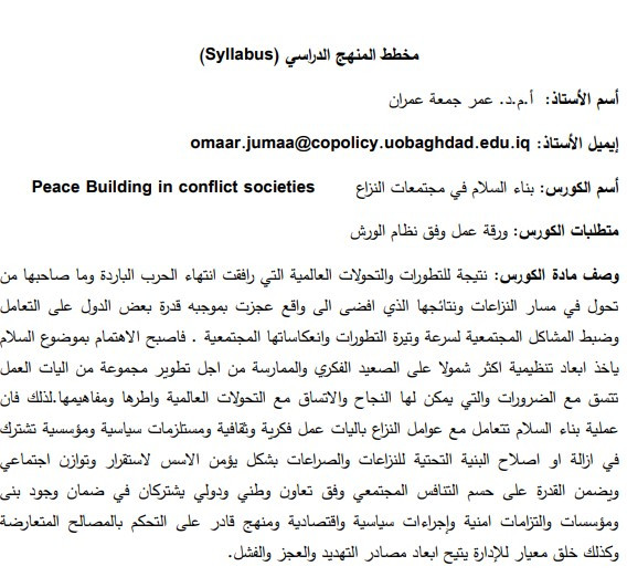 مقرر بناء السلام في مجتمعات النزاع سنة النشر: 2022 المؤلف: Omer Omran المؤلف المؤسسي: Baghdad University المقرر يعالج اسس ومرتكزات ومقومات واليات عملية بناء السلام في مجتمعات النزاع بمنهج تحليلي واطار موضوعي وعلمي من خلال البحث في ماهية الأليات التي تمكن من تحقيق تجاوب محلي أو وطني لعملية بناء السلام وإعادة التأهيل المجتمعي لمجتمعات النزاع وهذه العملية تتناسب مع غاية اهتماماتنا العلمية والمهنية من أجل بناء سلام أهلي ومجتمعي يرفد مستقبل المجتمعات بمقومات التطوير والتوجيه المتواصل لمواجهة التحديات التي تفرضها النزاعات الداخلية في مسيرة الوجود الإنساني أولا والتقدم والتنمية وتأسيس المشروع التحديثي والاستقرار الوطني ثانيا.