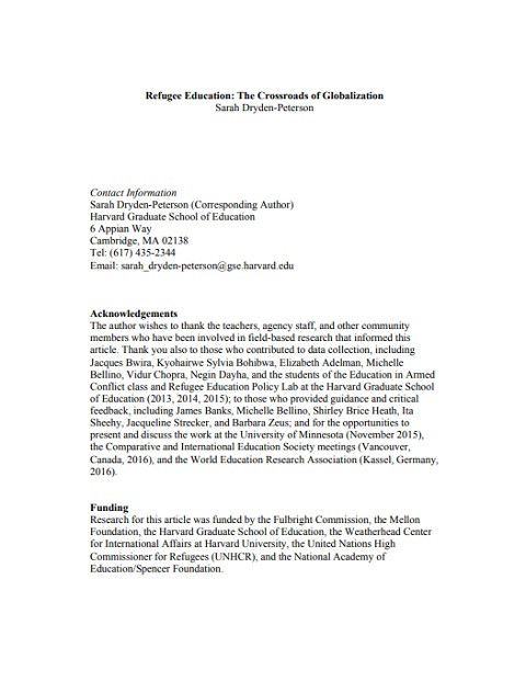 Refugee Education: The Crossroads of Globalization (Educational Researcher; vol. 45, no. 9) Year of publication: 2016 Author: Sarah Dryden-Peterson Corporate author: Harvard University In this article, the author probes a question at the core of comparative education โ how to realize the right to education for all and ensure opportunities to use that education for future participation in society. She does so thorough examination of refugee education from World War II to the present, including analysis of an original dataset of documents (n=214) and semi-structured interviews (n=208). The data illuminate how refugee children are caught between the global promise of universal human rights, the definition of citizenship rights within nation-states, and the realization of these sets of rights in everyday practices.