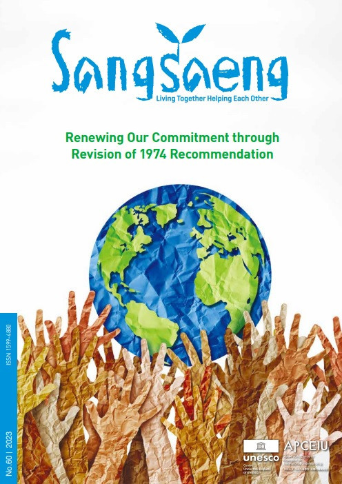 Addressing Educational Challenges In the Era of Pandemics (SangSaeng no.55, 2020) Year of publication: 2023 Corporate author: APCEIU With the prolonged COVID-19 pandemic, the global crisis has further aggravated various multifaceted challenges to humanity. We are forced to prepare for another paradigm shift or, in other words, a “New Normal.” With this in mind, the 55th edition of SangSaeng focuses on “Addressing Educational Challenges in the Era of Pandemics.” Contents03 Editor’s Note04 Special ColumnTowards Sustainability: Implications of Pandemic and How to Create the Future We All Want / Jae C. Choe 08 FOCUS: Addressing Educational Challenges in the Era of Pandemics08 Rethinking Education in the Shadow of the Pandemic / Edward Vickers12 Reimagining Education System to Reduce Social Inequalities / Paul R. Carr16 Reshaping Kenya for Beyond COVID / Jane Wanjiru Nyaga19 Rethinking Human Rights Education in the Pandemic / Abraham Magendzo K.22 Prioritizing GCED in Recovery of Pandemic: Challenges and Opportunities / Romina Kasman 26 Best Practices26 Loxo Yakaar: Hands of Hope / Karima Grant and Chakera McIntosh29 Care for Tomorrow Starts Today / Tina Trdin 32 Special ReportReport on the Round Table: “Next Normal” We Make / IGCED, APCEIU 36 Story TimeHow Do You Paint? / Recka Olasiman 38 Peace in My MemoryGive Me Peace on Earth / Libby Giles 41 Understanding the Asia-Pacific RegionWater Heritage in Southeast Asia / Karen Chin Ai Ying 45 GCED Youth NetworkMeaningful Spaces to Exchange and Learn Together / GCED Youth Network Core Group 48 LetterPromoting GCED in Sri Lanka / Deshamanya A.L.S. Abeywickrama 50 APCEIU in Action