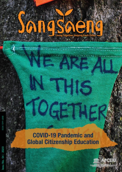 COVID-19 Pandemic and Global Citizenship Education (SangSaeng no.54, 2020) Year of publication: 2023 Corporate author: APCEIU Considering the significance of the global pandemic crisis, the 54th edition of SangSaeng focuses on the “COVID-19 Pandemic and Global Citizenship Education.” This issue invites readers to explore how the pandemic has affected the global community and reflect on how we should and can work together to address our common, multifaceted challenges while enhancing global citizenship and solidarity. Contents03 Editor’s Note04 Special Column What Changes Do We Want in the Post-Coronavirus World? / Hyun Mook Lim 08 FOCUS: COVID-19 Pandemic and Global Citizenship Education08 Reflecting on Global Citizenship Education in the Era of the Pandemic / Soon-Yong Pak12 Choosing Our Post-Pandemic World / Ilan Kelman16 Political Economy of COVID-19 and Global Cooperation / Chang-Yup Kim21 Peace in the Time of Global Pandemic / Yonas Adaye Adeto25 The Pandemic Stall of 2020 / Virginia A. Miralao30 Marine Conservation Efforts in Uncertain Times / Kerstin Forsberg35 Plague, Prejudice and Protest: The Role of Education in Pandemic World / Lynn Davies39 Media and Information Literacy Matters in Preparing for Post-Pandemic World / Divina Frau-Meigs 44 GCED Youth NetworkYouth Voices on the COVID-19 Pandemic and a New Work / Diego Manrique, Tshering Zangmo and Zanji Sinkala in collaboration with Hadi Althib 50 APCEIU in Action