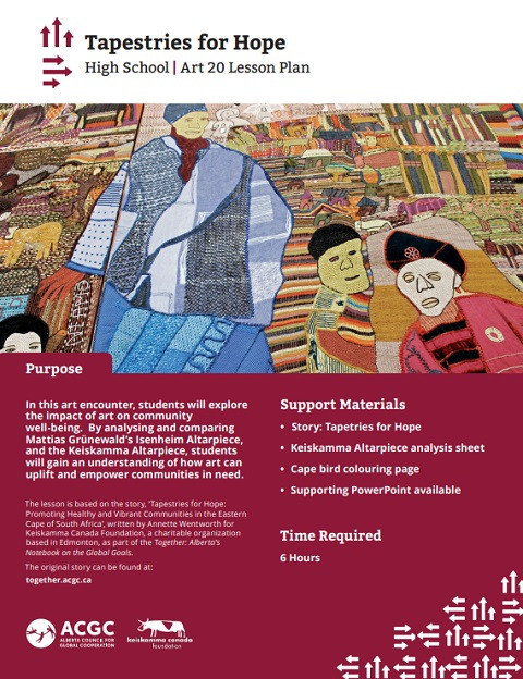 Tapestries for Hope: High School Art 20 Lesson Plan Year of publication: 2018 Corporate author: Alberta Council for Global Cooperation (ACGC) | Keiskamma Canada Foundation In this art encounter, students will explore the impact of art on community well-being. By analysing and comparing Mattias Grünewald’s Isenheim Altarpiece, and the Keiskamma Altarpiece, students will gain an understanding of how art can uplift and empower communities in need. The lesson is based on the story, ‘Tapestries for Hope: Promoting Healthy and Vibrant Communities in the Eastern Cape of South Africa’, written by Annette Wentworth for Keiskamma Canada Foundation, a charitable organization based in Edmonton, as part of the Together: Alberta’s Notebook on the Global Goals.