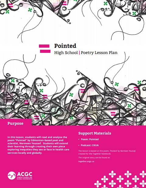 Pointed: High School Poetry Lesson Plan Year of publication: 2019 Corporate author: Alberta Council for Global Cooperation (ACGC) In this lesson, students will read and analyse the poem “Pointed” by Edmonton-based poet and scientist, Nermeen Youssef. Students will extend their learning through creating their own piece exploring inequities they see or face in health care services locally and globally.