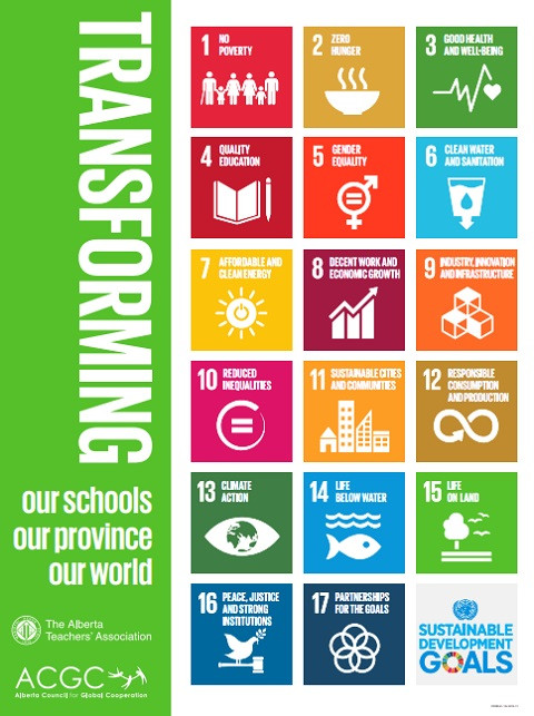 Transforming Our Schools, Our Province, Our World Year of publication: 2015 Corporate author: Alberta Council for Global Cooperation (ACGC) | The Alberta Teachers' Association (ATA) This is a poster about the SDGs for classrooms, made by ACGC and the Alberta Teachers’ Association.