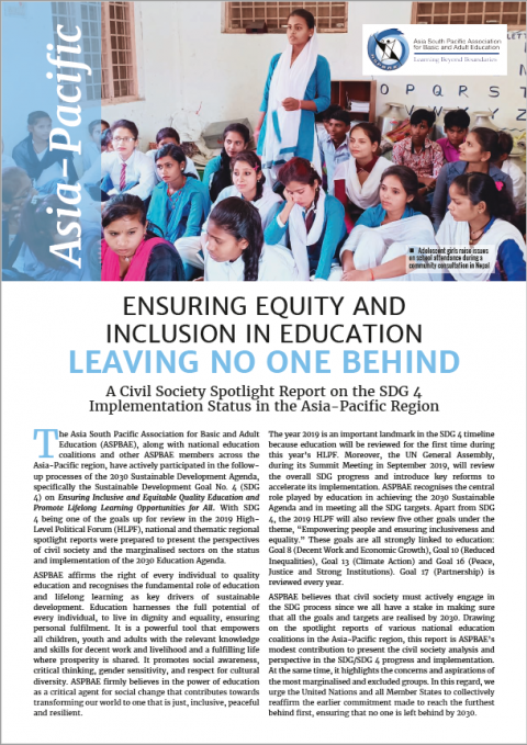 Asia-Pacific Spotlight Report on SDG 4 Year of publication: 2019 Corporate author: Asia South Pacific Association for Basic and Adult Education (ASPBAE) ASPBAE believes that civil society must actively engage in the SDG process since we all have a stake in making sure that all the goals and targets are realised by 2030. Drawing on the spotlight reports of various national education coalitions in the Asia-Pacific region, this report is ASPBAEโs modest contribution to present the civil society analysis and perspective in the SDG/SDG 4 progress and implementation. At the same time, it highlights the concerns and aspirations of the most marginalised and excluded groups. In this regard, we urge the United Nations and all Member States to collectively reaffirm the earlier commitment made to reach the furthest behind first, ensuring that no one is left behind by 2030.
