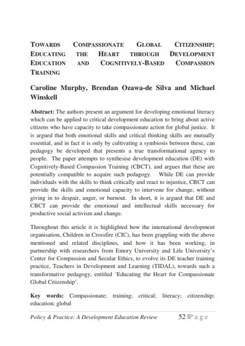 Towards Compassionate Global Citizenship: Educating the Heart through Development Education and Cognitively-Based Compassion Training (Vol. 19, Autumn, 2014) Year of publication: 2014 Author: Caroline Murphy | Brendan Ozawa-de Silva | Michael Winskel Corporate author: Centre for Global Education (CGE) The authors present an argument for developing emotional literacy which can be applied to critical development education to bring about active citizens who have capacity to take compassionate action for global justice. It is argued that both emotional skills and critical thinking skills are mutually essential, and in fact it is only by cultivating a symbiosis between these, can pedagogy be developed that presents a true transformational agency to people. The paper attempts to synthesise development education (DE) with Cognitively-Based Compassion Training (CBCT), and argues that these are potentially compatible to acquire such pedagogy. While DE can provide individuals with the skills to think critically and react to injustice, CBCT can provide the skills and emotional capacity to intervene for change, without giving in to despair, anger, or burnout. In short, it is argued that DE and CBCT can provide the emotional and intellectual skills necessary for productive social activism and change. Throughout this article it is highlighted how the international development organisation, Children in Crossfire (CIC), has been grappling with the above mentioned and related disciplines, and how it has been working, in partnership with researchers from Emory University and Life University’s Center for Compassion and Secular Ethics, to evolve its DE teacher training practice, Teachers in Development and Learning (TIDAL), towards such a transformative pedagogy, entitled ‘Educating the Heart for Compassionate Global Citizenship’.