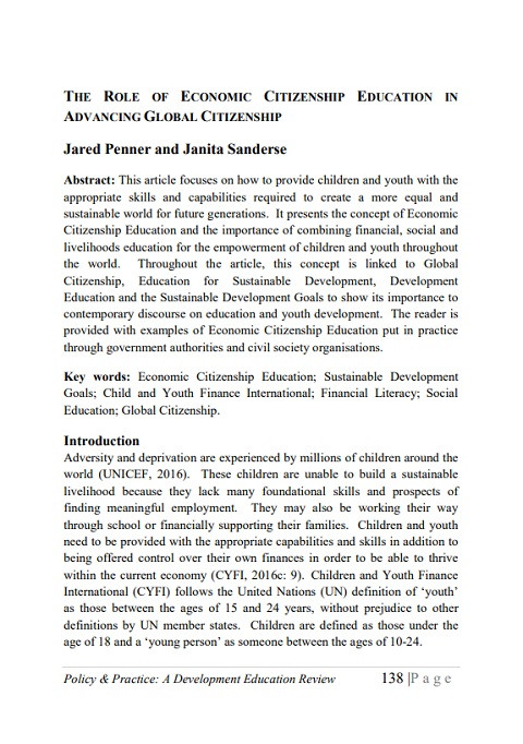 The Role of Economic Citizenship Education in Advancing Global Citizenship (Policy & Practice: A Development Education Review; Vol. 24, Spring) Year of publication: 2017 Author: Jared Penner | Janita Sanderse Corporate author: Centre for Global Education (CGE) This article focuses on how to provide children and youth with the appropriate skills and capabilities required to create a more equal and sustainable world for future generations. It presents the concept of Economic Citizenship Education and the importance of combining financial, social and livelihoods education for the empowerment of children and youth throughout the world. Throughout the article, this concept is linked to Global Citizenship, Education for Sustainable Development, Development Education and the Sustainable Development Goals to show its importance to contemporary discourse on education and youth development. The reader is provided with examples of Economic Citizenship Education put in practice through government authorities and civil society organisations.
