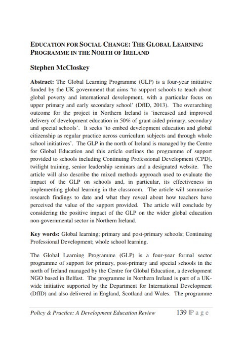 Education for Social Change: The Global Learning Programme in the North of Ireland (Policy and Practice: A Development Education Review; Vol. 23, Autumn) Year of publication: 2016 Author: Stephen McCloskey Corporate author: Centre for Global Education (CGE) The Global Learning Programme (GLP) is a four-year initiative funded by the UK government that aims ‘to support schools to teach about global poverty and international development, with a particular focus on upper primary and early secondary school’ (DfID, 2013). The overarching outcome for the project in Northern Ireland is ‘increased and improved delivery of development education in 50% of grant aided primary, secondary and special schools’. It seeks ‘to embed development education and global citizenship as regular practice across curriculum subjects and through whole school initiatives’. The GLP in the north of Ireland is managed by the Centre for Global Education and this article outlines the programme of support provided to schools including Continuing Professional Development (CPD), twilight training, senior leadership seminars and a designated website. The article will also describe the mixed methods approach used to evaluate the impact of the GLP on schools and, in particular, its effectiveness in implementing global learning in the classroom. The article will summarise research findings to date and what they reveal about how teachers have perceived the value of the support provided. The article will conclude by considering the positive impact of the GLP on the wider global education non-governmental sector in Northern Ireland.