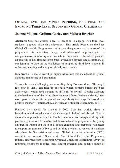 Opening Eyes and Minds: Inspiring, Educating and Engaging Third Level Students in Global Education (Policy and Practice: A Development Education Review; Vol. 19, Autumn) Year of publication: 2014 Author: Joanne Malone | Gráinne Carley | Meliosa Bracken Corporate author: Centre for Global Education (CGE) Suas has worked since its inception to engage Irish third level students in global citizenship education. This article focuses on the Suas Global Citizenship Programme, setting out the purpose and context of the programme, its innovative design and educational approach and its comprehensive monitoring and evaluation framework. The article presents an analysis of key findings from Suas’ evaluation process and a summary of our learning to date on the challenges of supporting third level students in reflecting, learning and acting on global justice issues.