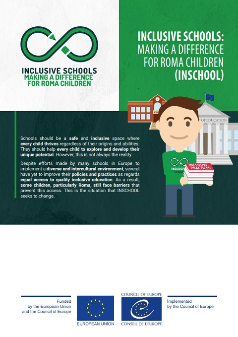 Inclusive Schools: Making a Difference for Roma Children (Inschool) Corporate author: European Union (EU) | Council of Europe This leaflet presents a joint project of the European Union and the Council of Europe on “Inclusive schools: making a difference for Roma children” targeting schools where Roma children learn, in the Czech Republic, Hungary, Romania, Slovak Republic and United Kingdom. The project aims at enhancing social inclusion of Roma by promoting inclusive education policies and practices in Europe.