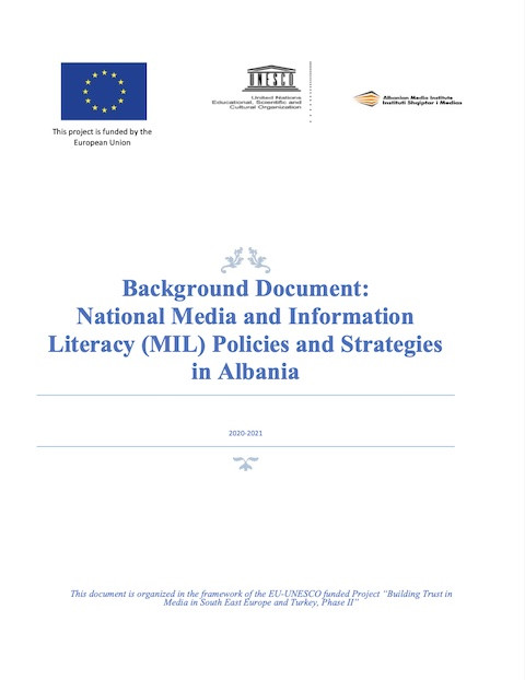 Background Document: National Media and Information Literacy (MIL) Policies and Strategies in Albania; 2020-2021 Year of publication: 2021 Corporate author: Albanian Media Institute | European Union (EU) | UNESCO This background study was conducted in the framework of the project "Building trust in the media in Southeast Europe and Turkey, phase II" supported by UNESCO and the European Union and implemented by the Albanian Media Institute. The project, at this stage of implementation, aims to increase the skills of young people for media and information literacy (MIL) through the integration of the MIL curriculum in the formal education system in Albania. The implementation of the project started in June 2020 and will last until 2022. This document suggests objectives for MIL policies and strategy, which should be extended to formal education (university and pre-university level); in non-formal and informal education thus affecting all members of society with the aim of increasing the level of education on media and information in Albania.