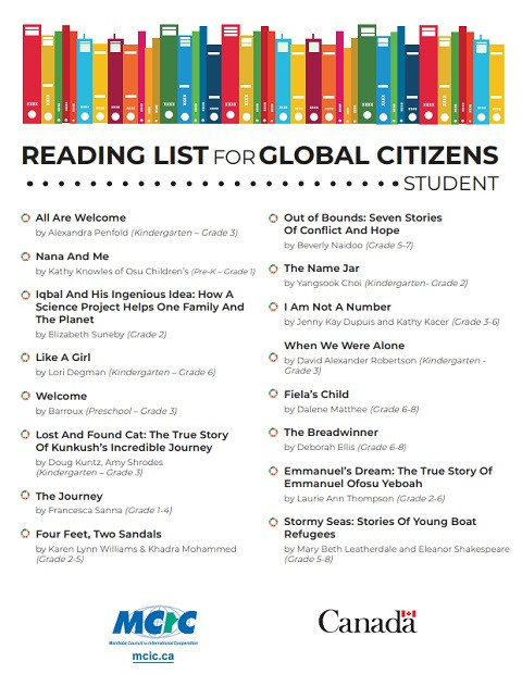 Reading List for Global Citizens: Student Year of publication: 2020 Corporate author: Manitoba Council for International Cooperation (MCIC) | Global Affairs Canada (GAC) This is a reading list for global citizens from Kindergarten to Grade 12. These books will inspire students to take action whether they are passionate about food security, ending poverty, supporting womenโs rights, or protecting the environment.
