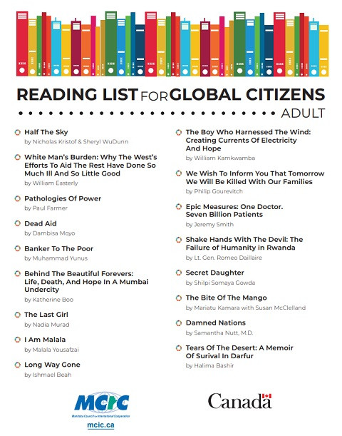 Reading List for Global Citizens: Adult Year of publication: 2020 Corporate author: Manitoba Council for International Cooperation (MCIC) | Global Affairs Canada (GAC) This reading list helps readers to be a global citizen by reading books that are informative and inspiring.