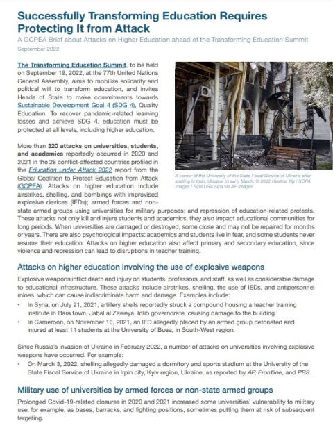 Successfully Transforming Education Requires Protecting It from Attack Year of publication: 2022 Corporate author: Global Coalition to Protect Education from Attack (GCPEA) The Transforming Education Summit, to be held on September 19, 2022, at the 77th United Nations General Assembly, aims to mobilize solidarity and political will to transform education, and invites Heads of State to make commitments towards Sustainable Development Goal 4 (SDG 4), Quality Education. To recover pandemic-related learning losses and achieve SDG 4, education must be protected at all levels, including higher education.