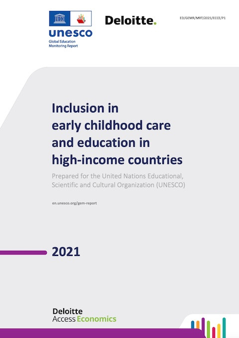 Inclusion in Early Childhood Care and Education in High-Income Countries Year of publication: 2021 Corporate author: Global Education Monitoring Report Team | UNESCO | Deloitte Access Economics This report reviews the international research and policy literature concerning approaches to inclusion in early childhood care and education (ECCE) in different high-income jurisdictions globally. Each chapter highlights examples of policies and practices which can foster inclusion in ECCE across the themes set out in the Global Education Monitoring (GEM) Report in 2020.As a critical period for children’s intellectual, emotional, social, physical and moral development, supporting inclusion in ECCE is of particular importance for supporting lifelong learning and equitable opportunities for all children. A number of key messages emerging from this review that are instructive to designing policies to promote inclusion in ECCE are summarised below. Inclusion in ECCE is fostered through complementary universal and targeted approaches to most aspects of ECCE governance, financing, policy and service delivery. The implementation of ECCE laws and policies is key to supporting inclusion. As the central actors delivering ECCE services, collaboration within the ECCE workforce is crucial to supporting a community of practice which leads and shares inclusion, while avoiding risks of specialisation. Finally, while many existing ECCE policies, resources and tools are grounded in a deficits-based approach to understanding need, inclusion may be better supported through an approach which focusses on child learning needs and strengths.