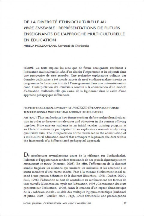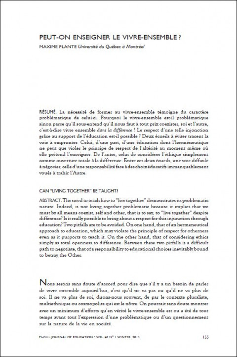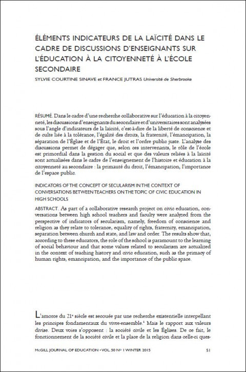 The Role of Teachers in Education and Democracy: The Impact of a Research Project on Preservice Teacher Perceptions Year of publication: 2015 Author: Gina Thésée | Paul R. Carr | Franck Potwora Corporate author: McGill University. Faculty of Education This article presents reflections on a survey questionnaire related to the connection between education and democracy. A sample of 157 teacher-education students in Montreal completed a follow-up questionnaire after having participated in a research questionnaire (first study) concerning their perception and experience of the linkage between education and democracy. The first study underscored a weak democratic experience as well as an educational journey without a strong linkage to democracy, which concurs with our previous findings. However, the results of the follow-up survey indicate that participation in this inquiry generated socio-educational, epistemological, pedagogical, and methodological reflections, which could have significant implications for the perception of the role of educators.
