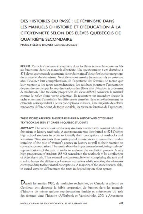These Stories are From the Past: Feminism in History and Citizenship Textbooks as Seen by Grade 10 Quebec Students (McGill Journal of Education; Vol. 52, No. 2) Year of publication: 2017 Author: Marie-Hélène Brunet Corporate author: McGill University. Faculty of Education The article looks at the way students interact with content related to feminism in history textbooks. A questionnaire was distributed to 575 Québec high school students in order to identify their conceptions of textbooks and feminism. Nine students then participated in interviews to assess their understanding of the role of women’s agency in history as well as their reaction to contradictory narratives. The results show the importance of considering students’ representations of the past in order to evaluate the mediation process. A very high proportion of students (88 %) considered the textbook to be a reflection of objective truth. They seemed uncomfortable when completing the task and tried to lessen the differences between narratives while selecting the elements corresponding to their initial conceptions. A majority of the students were able, in varied ways, to differentiate the texts in depending on their agency.