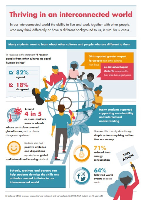 Thriving in an Interconnected World Year of publication: 2020 Corporate author: OECD This infographic shows how ready students are to thrive in an interconnected world. All data were collected from PISA 2018 survey.