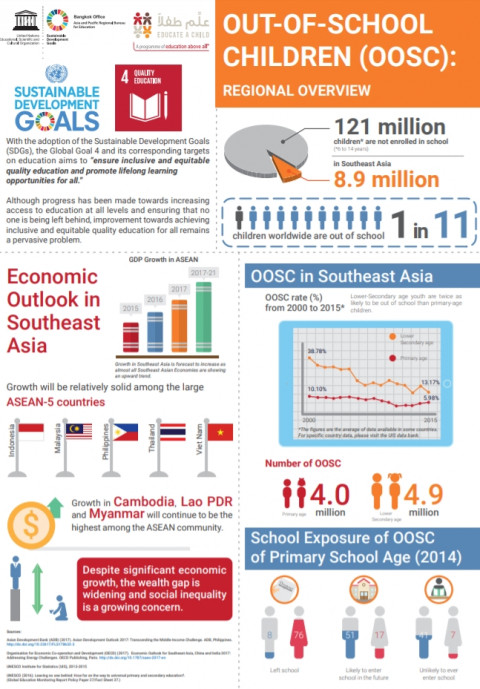 Out-of-School Children (OOSC): regional overview Year of publication: 2017 Corporate author: UNESCO Office Bangkok and Regional Bureau for Education in Asia and the Pacific This leaflet provides a regional overview of out-of-school children (OOSC) situation in Southeast Asia including school exposure of OOSC of primary school age. To provide learning opportunities for OOSC in the region, UNESCO Bangkok has launched the project titled “Strengthening Education Systems for Out of School Children” with the support of Educate a Child (EAC). Information on country activities implemented under the project is included in the leaflet.