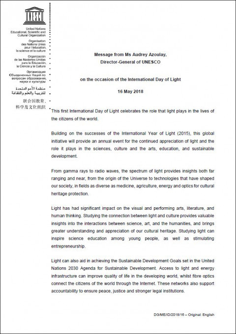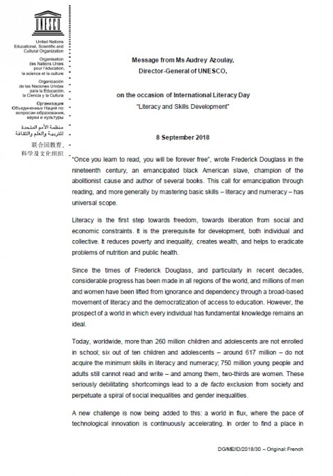 Message from Ms Audrey Azoulay, Director-General of UNESCO, on the occasion of International Literacy Day, 8 September 2018 Year of publication: 2018 Corporate author: UNESCO. Director-General, 2017- (Azoulay, A.) This message was delivered by Audrey Azoulay, Director-General of UNESCO, on the occasion of the International Day of Literacy, on 8 September 2018.