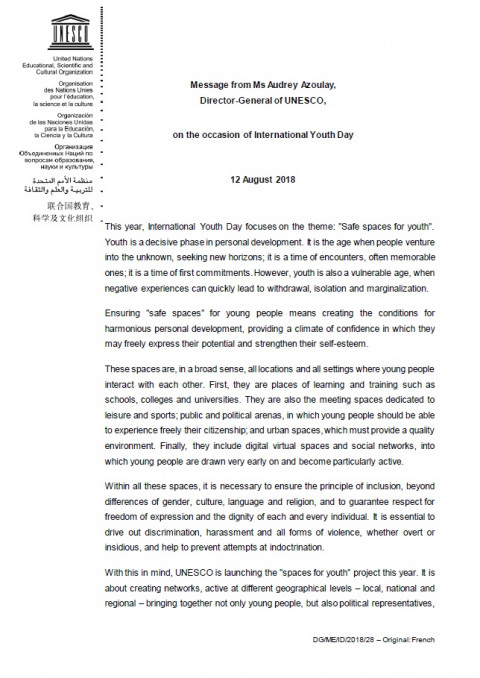 Message from Ms Audrey Azoulay, Director-General of UNESCO, on the occasion of International Youth Day, 12 August 2018 Year of publication: 2018 Corporate author: UNESCO. Director-General, 2017- (Azoulay, A.) This message was delivered by Audrey Azoulay, Director-General of UNESCO, on the occasion of the International Youth Day, 12 August 2018.