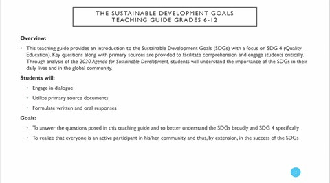 Teachers Guide on the SDGs Year of publication: 2022 Corporate author: United Nations (UN) This teaching guide, aimed at grade level K-12, gives an introduction and historical background to the SDGs. Key questions along with primary resources are provided to facilitate comprehension and engage students critically. Through analysis of the Preamble to the 2030 Agenda for Sustainable Development, the connection will be made to the Millenium Development Goals and Human Rights, to demonstrate continuity and evolution of certain principle values held by the international community. Focus then shifts to SDG 4, quality education, so that students can ore clearly analyze the progress that has been made regarding this topic on a micro level.
