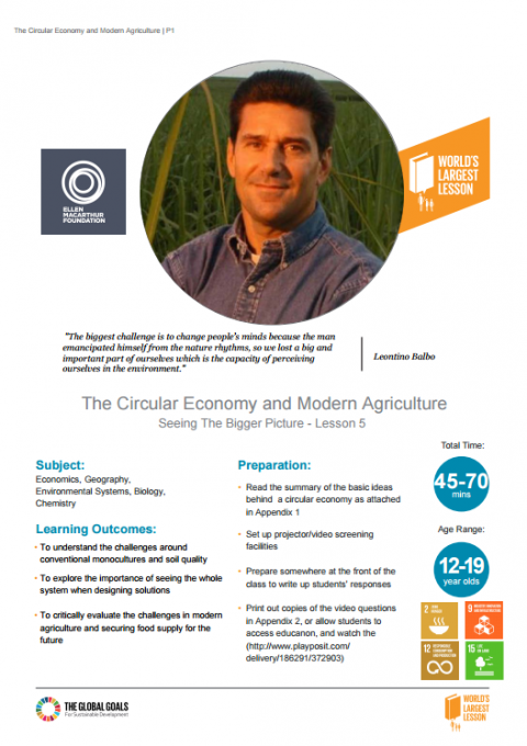 The Circular Economy and Modern Agriculture: Seeing The Bigger Picture - Lesson 5 Corporate author: United Nations Children's Fund (UNICEF) World’s Largest Lesson is a collaborative education project to support the announcement of the United Nations Global Goals for Sustainable Development. Learning outcomes of the project: • To understand the challenges around conventional monocultures and soil quality • To explore the importance of seeing the whole system when designing solutions • To critically evaluate the challenges in modern agriculture and securing food supply for the future