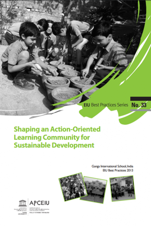 EIU Best Practices Series No.33: Shaping an Action-Oriented Learning Community for Sustainable Development Year of publication: 2013 Corporate author: APCEIU This monograph is one of APCEIU's EIU Best Practices Series, which aims to encourage educators, scholars, and activists to implement and share local initiatives on EIU. The Series No.33 introduces a program implemented at the Ganga International School in India to promote eco-friendly and multicultural society. Teachers, students, and local community members engaged in awareness raising events such as Recycled Paper Art exhibition, Tree Plantation Drive, and Anti-Malaria Project, allowing everyone to absorb the meaning of EIU and sustainable development. Furthermore, students partook in seed exchange program and video conferences to discuss environmental issues with students of partner schools, which amplified impact at local and global levels.