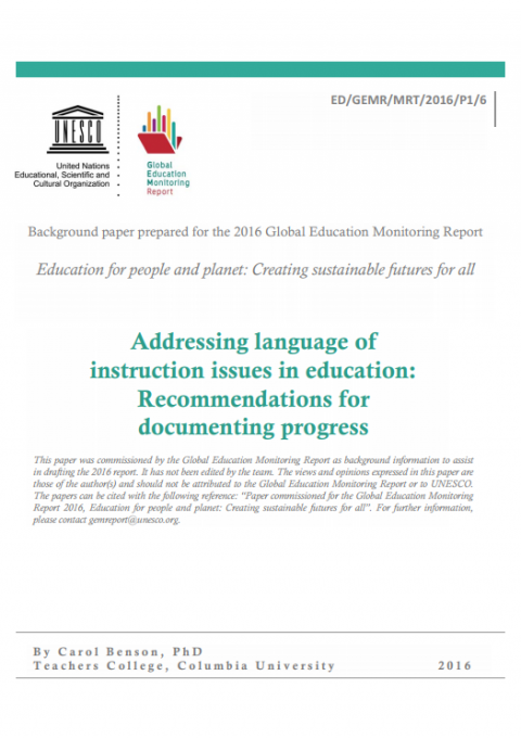 Addressing language of instruction issues in education: recommendations for documenting progress Year of publication: 2016 Author: Carol Benson Corporate author: Columbia University (USA). Teachers College This paper offers evidence-based recommendations for documenting international progress towards addressing language issues in education. The focus is on adapting the school language(s) of instruction to the home language(s) of learners. The paper begins by defining terms like L1 and explaining the concepts underlying multilingual education (MLE). Next there is a discussion of how to capture relevant linguistic and educational information from policy documents and linguistic sources, with examples from lowincome countries. This is followed by a set of questions that can and should be asked of any program to evaluate progress in addressing instructional language issues, focusing on the approach/methodology, teacher languages and skills, learner assessment, and program management, monitoring and evaluation. The paper concludes with some possible global indicators and suggestions for further research.