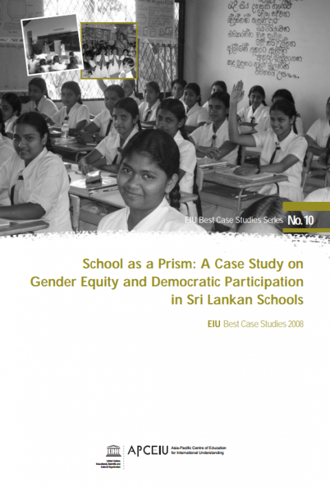 EIU Best Practices Series No. 10: School as a Prism: A Case Study on Gender Equity and Democratic Participation in Sri Lanka Schools Year of publication: 2008 Corporate author: APCEIU This report is one of the APCEIU's EIU Best Practices Series, which aims to encourage educators, scholars, and activists to implement and share local initiatives on EIU. The Series No.10 introduces a study of nine schools in Sri Lanka, which has been conducted to analyze current practices of gender education and provide suggestions for improvement. Upon careful assessment of documentary surveys, interviews, self-reports, and historical data analysis, the result indicates that gender equality and democratic participation are substantially provided and prioritized in Sri Lankan schools, in lieu of EIU theme of social justice. As common challenges still exist, the research notes the need to further examine learning patterns of boys and girls, classroom-specific gender issues, and good practices that promote role of women in democratic participation.