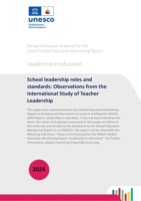 School Leadership Roles and Standards: Observations from the International Study of Teacher Leadership Year of publication: 2024 Author: Charles F. Webber | Dorothy Andrews | C.P. van der Vyver | Clelia Pineda-Báez | Janet M. Okoko | Edith J. Cisneros-Cohernour | José Gabriel Domínguez-Castillo | Mohammed Elmeski | Molly P. Fuller | Joan M. Conway | Cristina Moral-Santaella | Gloria Gratacós | Samira Idelcadi Corporate author: UNESCO | Global Education Monitoring Report Team This paper was commissioned by the Global Education Monitoring Report as background information to assist in drafting the 2024/5 GEM Report, Leadership in education. This report summarizes the findings of the International Study of Teacher Leadership(ISTL), conducted in 12 countries. The researchers share descriptions of the increasing interest in teacher leadershipas a factor in student learning and school improvement. ISTL researchers focus primarily on classroom-based teachers who—in collaboration with formal school leaders, parents, community members, and colleagues—impact school-wide decision making and pedagogical practices. The report offers insights related to teacher leader behaviours, the complexity of teacher leadership, how teacher leaders learn to lead, and the importance of contextual factors that support and impede teachers who provide informal leadership to schools and the communities they serve. The researchers compare cross-cultural requirements of good leadership and offer contextually situated analyses of leadership visions and goals, the impact of teacher leadership on educational outcomes, necessary preconditions for effective leadership, and policies that develop teacher leadership. The researchers also describe the readiness of school communities to embrace teacher leadership, described variously as parallel leadership, shared leadership, and distributed leadership. The report argues for a shift from considering standards for teacher leadership—too often based on the assumption that leadership is consistent across cultural and organizational settings—to the more flexible and contextualized conceptualization of leadership dimensions such as purpose, self-awareness, intentionality, and culture building. The ISTL researchers also argue that teacher leadership is but one component of an integrated approach to educational governance that addresses the complexities of teaching and learning in relation to rapid socioeconomic change, global migration, political tensions, and the emergence of new technologies. The ISTL also reinforces the ongoing importance of classroom teachers in the achievement of educational objectives. The ISTL team concludes this report with a set of research recommendations.