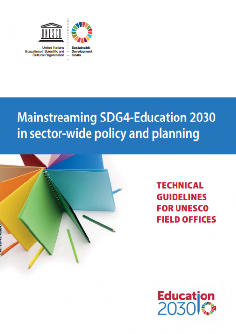 Mainstreaming SDG4-Education 2030 in sector-wide policy and planning: technical guidelines for UNESCO field offices Year of publication: 2016 Corporate author: UNESCO The main responsibility for implementing the SDG4-Education 2030 Agenda lies with governments, with UNESCO and partners providing support through coordinated policy advice, technical assistance, capacity development and monitoring of progress at global, regional and national levels. By their position, UNESCO field offices have a key role to play in providing such support at country level and therefore require adequate technical capacity to fulfil their mission.These guidelines aim at providing a basic resource to field offices for ensuring adequate technical support to national authorities in this process. In doing so, it takes into account different profiles of country needs and capacities, thus avoiding a one-size-fits-all approach. Countries may have different levels of awareness of, or political commitment to, Sustainable Development Goal 4 (SDG4). In all cases, UNESCO is expected to ensure that all the relevant information about SDG4-Education 2030 is properly disseminated and that national authorities and stakeholders are reminded of its importance. To assist field offices in this task UNESCO has developed and made available a number of resources and support materials, notably the Unpacking SDG4-Education 2030 Guide, parts of which are excerpted here, and will continue coordination efforts in this respect.Inevitably, field staff will have to adapt the guidelines provided here to the reality of the country they are serving. That is why this document is full of resources and pointers that can be combined and tailored to fit the particular context of each country. At the same time, field staff are invited to require additional technical guidance from the corresponding regional bureaus, which can rely on the backstopping of Headquarters services and support from the specialized institutes.These guidelines represent a first attempt to provide specific directions and resources to allow field offices to technically support Member States. After a first evaluation, in which all field staff are invited to participate, the guidelines will be improved so as to make them even more suitable and useful. They will also be supplemented with other material to ensure that UNESCO plays its role as the leading United Nations agency in the field.