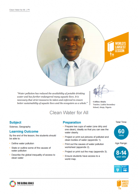 Clean Water for All Corporate author: United Nations Children's Fund (UNICEF) World’s Largest Lesson is a collaborative education project to support the announcement of the United Nations Global Goals for Sustainable Development. Learning outcome of the project: • Define water pollution • State or outline some of the causes of water pollution • Describe the global inequality of access to clean water