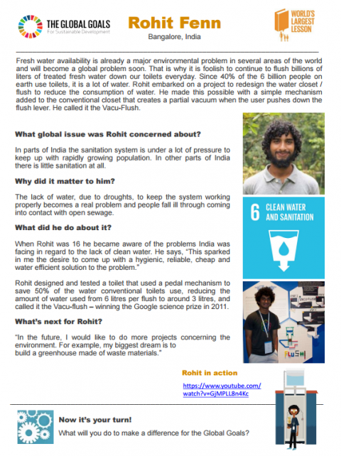 Rohit Fenn Corporate author: United Nations Children's Fund (UNICEF) Fresh water availability is already a major environmental problem in several areas of the world and will become a global problem soon. That is why it is foolish to continue to flush billions of liters of treated fresh water down our toilets everyday. Since 40% of the 6 billion people on earth use toilets, it is a lot of water. Rohit embarked on a project to redesign the water closet / flush to reduce the consumption of water. He made this possible with a simple mechanism added to the conventional closet that creates a partial vacuum when the user pushes down the flush lever. He called it the Vacu-Flush.