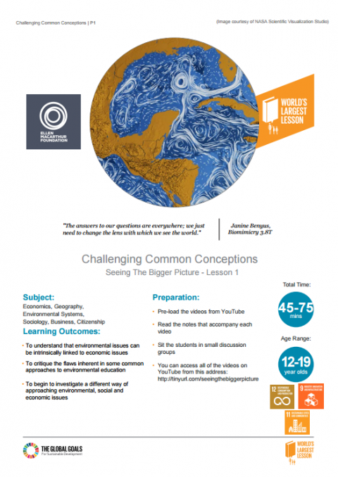 Challenging Common Conceptions: Seeing The Bigger Picture - Lesson 1 Corporate author: United Nations Children's Fund (UNICEF) World’s Largest Lesson is a collaborative education project to support the announcement of the United Nations Global Goals for Sustainable Development. Learning outcomes of the project: • To understand that environmental issues can be intrinsically linked to economic issues • To critique the flaws inherent in some common approaches to environmental education • To begin to investigate a different way of approaching environmental, social and economic issues