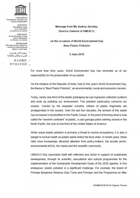 Message from Ms Audrey Azoulay, Director-General of UNESCO, on the occasion of World Environment Day, 5 June 2018 Year of publication: 2018 Corporate author: UNESCO. Director-General, 2017- (Azoulay, A.) This message was delivered by Audrey Azoulay, Director-General of UNESCO, on the occasion of World Environment Day, on 5 June 2018.