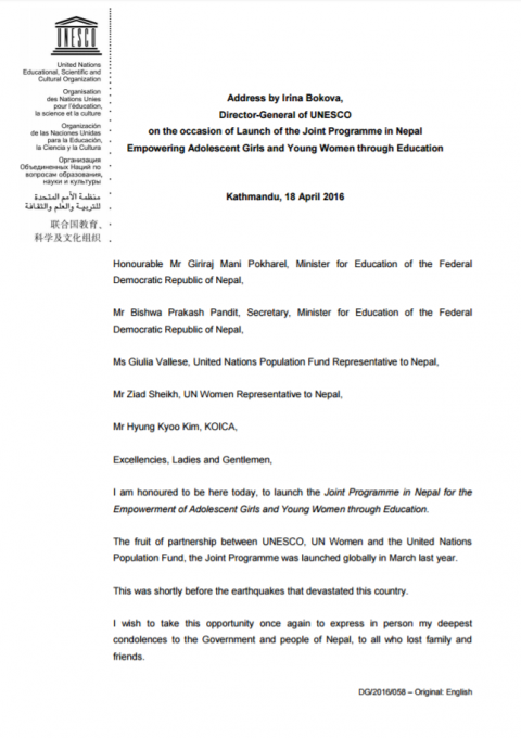 Addressed by Irina Bokova, Director-General of UNESCO on the Occasion of Launch of the Joint Programme in Nepal Empowering Adolescent Girls and Young Women through Education; Kathmandu, 18 April 2016 Year of publication: 2016 Corporate author: UNESCO. Director-General, 2009-(Bokova, I.G.)