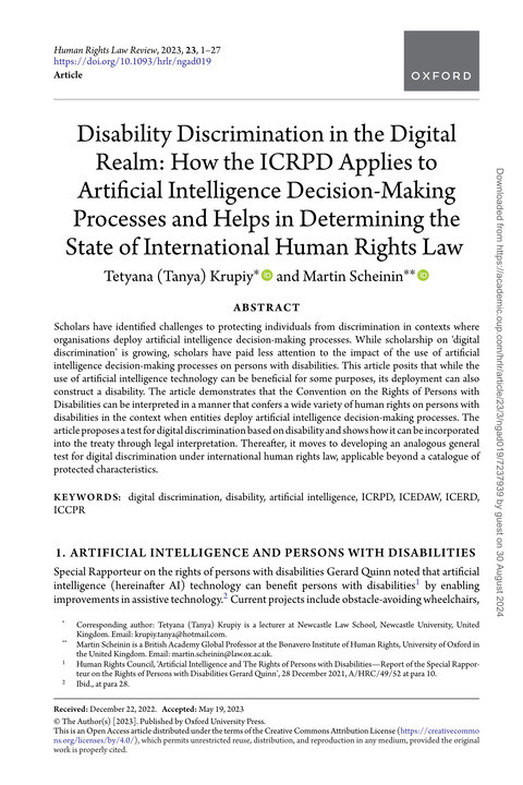 Disability Discrimination in the Digital Realm: How the ICRPD Applies to Artificial Intelligence Decision-Making Processes and Helps in Determining the State of International Human Rights Law (Human Rights Law Reivew; Volume. 23, Issue. 3) Year of publication: 2023 Author: Tetyana Krupiy | Martin Scheinin Scholars have identified challenges to protecting individuals from discrimination in contexts where organisations deploy artificial intelligence decision-making processes. While scholarship on ‘digital discrimination’ is growing, scholars have paid less attention to the impact of the use of artificial intelligence decision-making processes on persons with disabilities. This article posits that while the use of artificial intelligence technology can be beneficial for some purposes, its deployment can also construct a disability. The article demonstrates that the Convention on the Rights of Persons with Disabilities can be interpreted in a manner that confers a wide variety of human rights on persons with disabilities in the context when entities deploy artificial intelligence decision-making processes. The article proposes a test for digital discrimination based on disability and shows how it can be incorporated into the treaty through legal interpretation. Thereafter, it moves to developing an analogous general test for digital discrimination under international human rights law, applicable beyond a catalogue of protected characteristics.