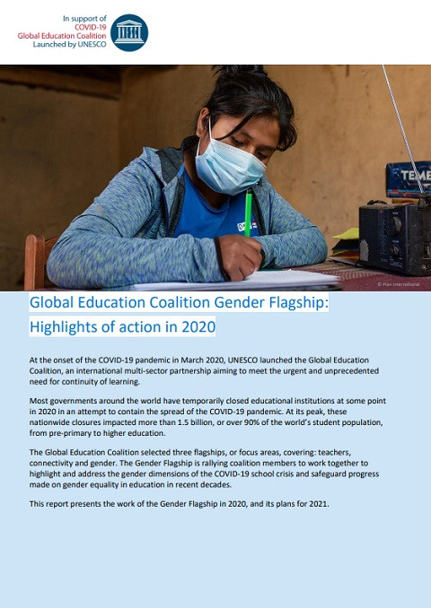 Global Education Coalition Gender Flagship: Highlights of Action in 2020 Year of publication: 2021 Corporate author: UNESCO At the onset of the COVID-19 pandemic in March 2020, UNESCO launched the Global Education Coalition, an international multi-sector partnership aiming to meet the urgent and unprecedented need for continuity of learning. Most governments around the world have temporarily closed educational institutions at some point in 2020 in an attempt to contain the spread of the COVID-19 pandemic. At its peak, these nationwide closures impacted more than 1.5 billion, or over 90% of the world’s student population, from pre-primary to higher education. The Global Education Coalition selected three flagships, or focus areas, covering: teachers, connectivity and gender. The Gender Flagship is rallying coalition members to work together to highlight and address the gender dimensions of the COVID-19 school crisis and safeguard progress made on gender equality in education in recent decades. This report presents the work of the Gender Flagship in 2020, and its plans for 2021.
