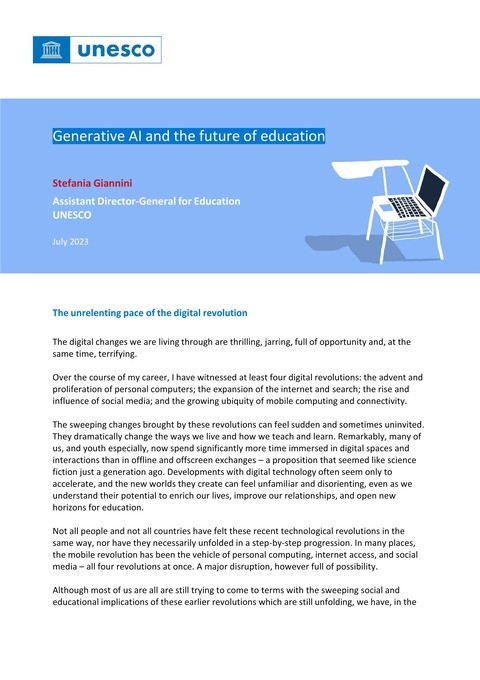 Generative AI and the Future of Education Year of publication: 2023 Corporate author: UNESCO. Assistant Director-General for Education, 2018- (Giannini, Stefania) The digital revolution has brought about significant changes in how we live, learn, and interact, with multiple waves of technological advancements. The current AI revolution represents a new and profound shift, particularly through AI's ability to simulate human language and conversation. This development challenges our understanding of language, intelligence, and the role of technology in education and society.As AI begins to generate human-like responses and knowledge, it raises fundamental questions about its impact on education, societal values, and our concept of humanity. Education systems are now grappling with how to integrate and regulate AI, which has been rapidly introduced into classrooms without sufficient oversight. The author emphasizes the importance of carefully considering the risks and ethical implications of AI, particularly in its potential to manipulate and shape knowledge systems. There is a need for balanced development, where AI technology is aligned with human values, and education remains a deeply human-centered process.UNESCO is working with countries to develop strategies for the safe use of AI in education, emphasizing the need for a cautious approach and robust regulatory frameworks. The overarching message is that while AI offers immense possibilities, it must be integrated thoughtfully to ensure it enhances education and society without undermining human agency, equity, or the foundational values of learning.